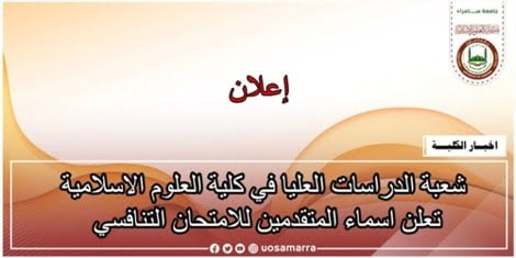 شعبة الدراسات العليا في كلية العلوم الاسلامية تعلن اسماء المتقدمين للامتحان التنافسي.