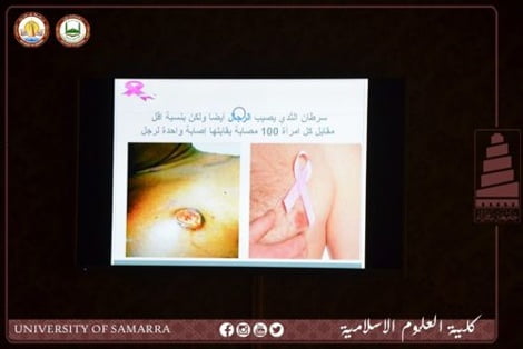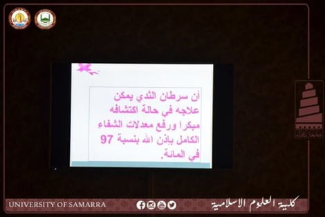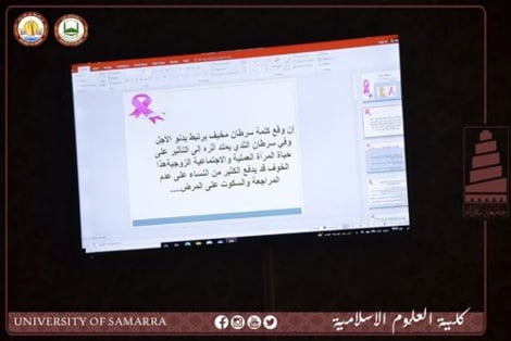 بتوجيه مباشر من السيد عميد كلية العلوم الاسلامية الأستاذ الدكتور *حسن أحمد الجواري* وتزامناً مع التوعية العالمية حول مرض (سرطان الثدي) وتفشي هذ المرض بين نساء محافظة صلاح الدين ، أقام قسم العقيدة والفكر الإسلامي وبالتعاون مع دائرة صحة صلاح الدين ووحدة تمكين المرأة يوم الاربعاء الموافق السادس عشر من تشرين الثاني الجاري وفي قاعة المعرفة الندوة العلمية ((الكشف المبكر عن الأورام السرطانية “سرطان الثدي”)) بحضور السيد عميد الكلية والسيد المعاون للشؤون الادارية والسيد رئيس قسم العقيدة والدكتورة انتصار مرهون زهوان طبيبة اختصاص طب الأسرة والمجتمع والدكتورة هدى عبد العيساوي – بورد عراقي والاخصائية في طب الاسرة ومسؤولة وحدة تمكين المرأة في الكلية المدرس الدكتور سارة عباس فرج والسيدة مسؤولة شعبة الاعلام سروه مدين محمد والعديد من طالبات وتدريسيات الكلية.
