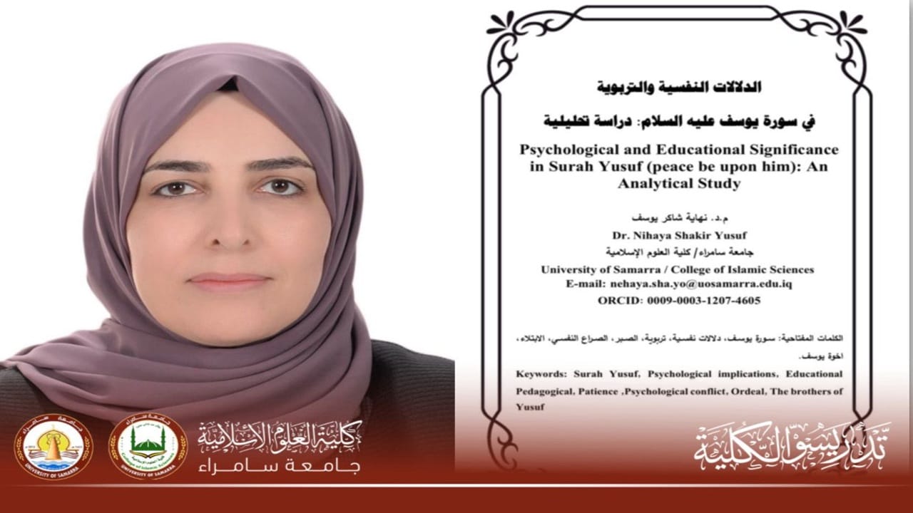 تدريسية من قسم العقيدة تنشر بحثا علميًا في الدلالات النفسية والتربوية في سورة يوسف عليه السلام