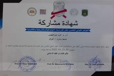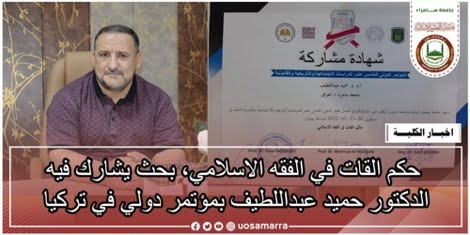 شارك التدريسي في كلية العلوم الاسلامية بجامعة سامراء الاستاذ المساعد الدكتور حميد عبداللطيف في المؤتمر الدولي الخامس عشر للدراسات الاجتماعية والتاريخية والقانونية والمقام في تركيا بجامعة عجلون الوطنية وجامعة ماردين ارتقلو، والمنعقد بتاريخ 20_ 23\ 5\2022 بمدينة اسطنبول، حيث شارك بورقة بحثية بعنوان (حكم القات في الفقه الاسلامي) وتأتي هذه المشاركة من خلال التبادل العلمي والخبرات العلمية التي ترعاها كليتنا من اجل النهوض بالواقع التعليمي على مستوى العراق ولتكون من الكليات المهمة والانفتاح على الجامعات الدولية الرصينة.