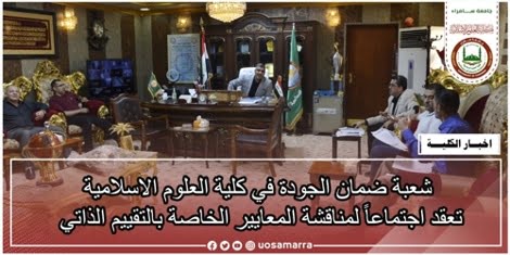 ترأس السيد عميد كلية العلوم الاسلامية بجامعة سامراء الاستاذ الدكتور حسن احمد الجواري اجتماعاً لشعبة ضمان الجودة والأداء الجامعي في الكلية ، حيث حضر الاجتماع معاون العميد للشؤون العلمية الاستاذ المساعد الدكتور عبدالحميد مزاحم ومعاون العميد للشؤون الادارية الاستاذ الدكتور كمال عبدالفتاح، فضلا عن مسؤول شعبة ضمان الجودة الاستاذ الدكتور محمد احمد شهاب ومسؤولي شعب الادارية والتسجيل والاعلام .