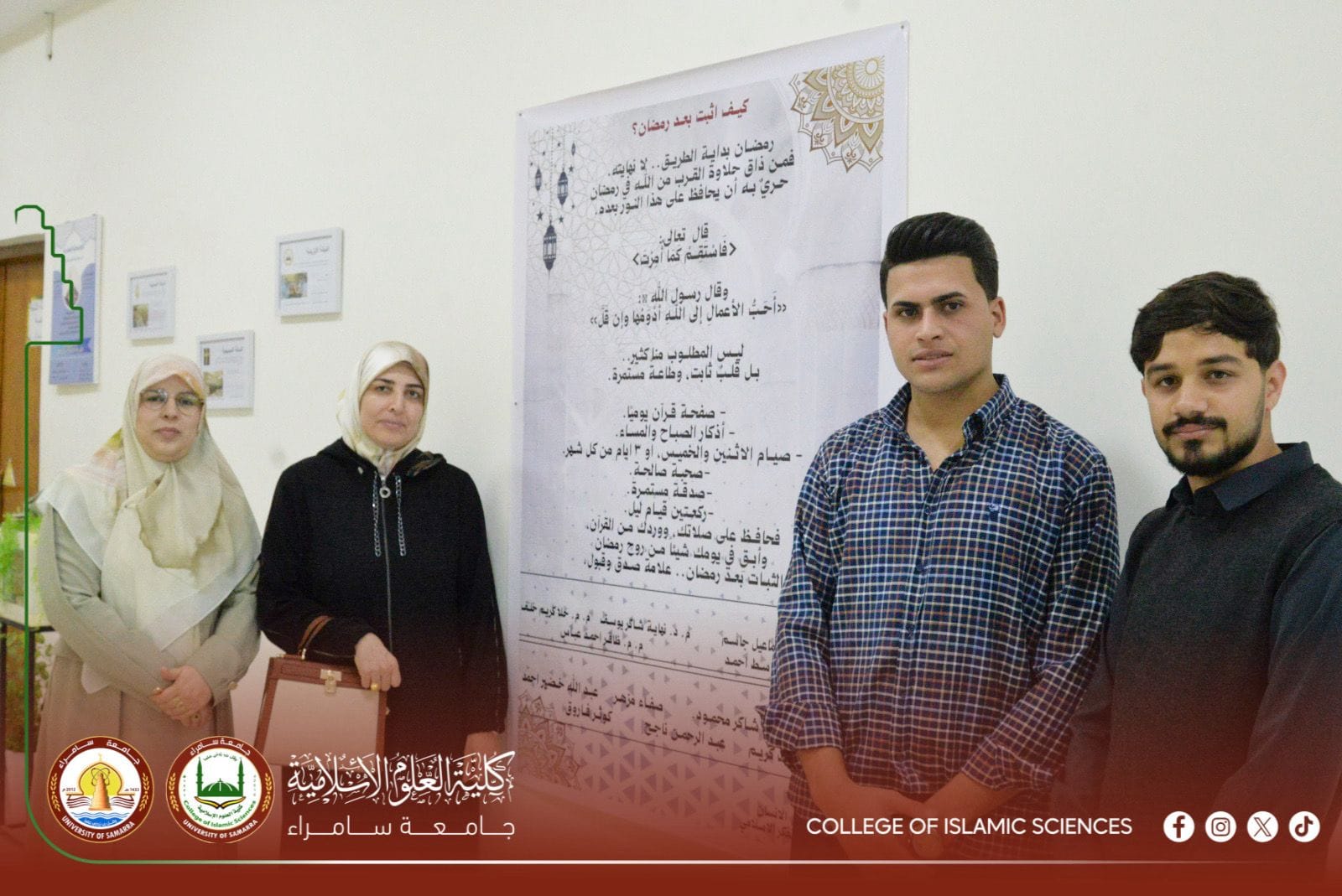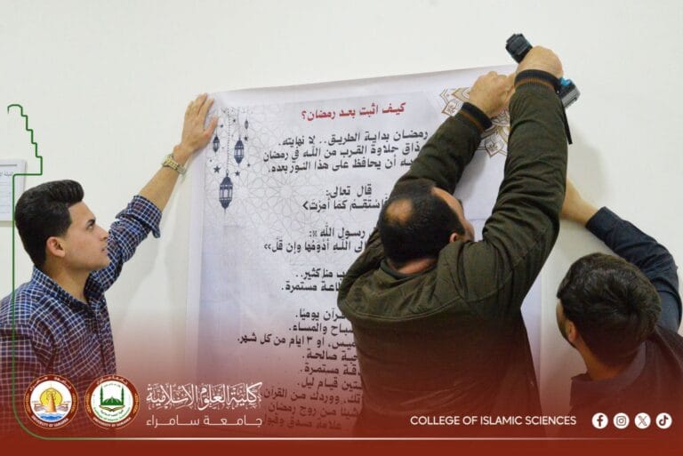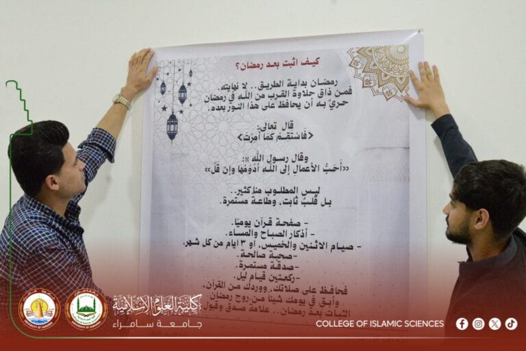 نظّمت وحدة حقوق الإنسان في كلية العلوم الإسلامية حملة توعوية تمثّلت في تلصيق بوسترات إرشادية داخل أروقة الكلية، حملت عنوان “رمضان بداية الطريق.. لا نهايته”، وذلك بهدف تعزيز مفهوم الاستمرارية في الطاعة بعد شهر رمضان المبارك. وتضمّنت البوسترات رسائل إيمانية مستندة إلى نصوص شرعية، منها قوله تعالى: ﴿فَاسْتَقِمْ كَمَا أُمِرْتَ﴾، وحديث النبي ﷺ: «أحبُّ الأعمال إلى الله أدْوَمُها وإنْ قلَّ»، حيث ركّزت الحملة على أهمية الثبات على العبادات وعدم الاقتصار على المواسم. كما اشتملت الحملة على جملة من التوجيهات العملية التي تعين على الاستمرار، مثل (المحافظة على ورد يومي من القرآن الكريم، والالتزام بأذكار الصباح والمساء، وصيام النوافل، والحرص على الصحبة الصالحة، والصدقة، وقيام الليل) بما يسهم في ترسيخ روح الإيمان في حياة الطلبة. وشهدت الحملة تفاعلاً ملحوظاً من الطلبة، لما تحمله من مضامين تربوية تعزّز الوعي الديني والسلوك الإيماني المستمر. هدفت الحملة إلى ترسيخ مبدأ الاستقامة والثبات على الطاعة بعد شهر رمضان المبارك، وتنمية الوعي لدى الطلبة بأهمية استدامة العمل الصالح، بما يسهم في بناء شخصية متوازنة ملتزمة بالقيم الإسلامية، ويعزز من حضور الجانب الإيماني في الحياة اليومية داخل البيئة الجامعية وخارجها.