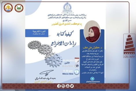 ( كيفية كتابة براءات الاختراع) ، يقدم الندوة تدريسية كلية الطب لجامعة ابن سينا الدكتورة كوثر علي خلف.