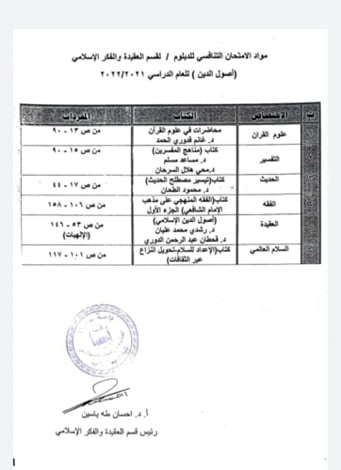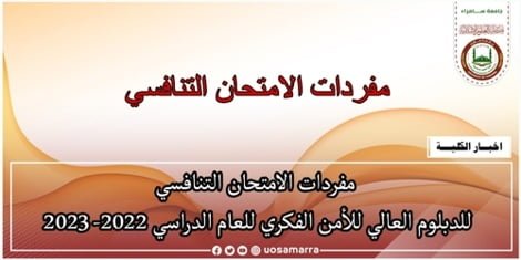 مفردات الامتحان التنافسي للدبلوم العالي للأمن الفكري للعام الدراسي ٢٠٢٢- ٢٠٢٣. الكاتب: كلية العلوم الإسلامية جامعة سامراء أبريل 18, 2022 مهم جداً للمتقدمين للامتحان التنافسي (الدبلوم الفكري للأمن الفكري)