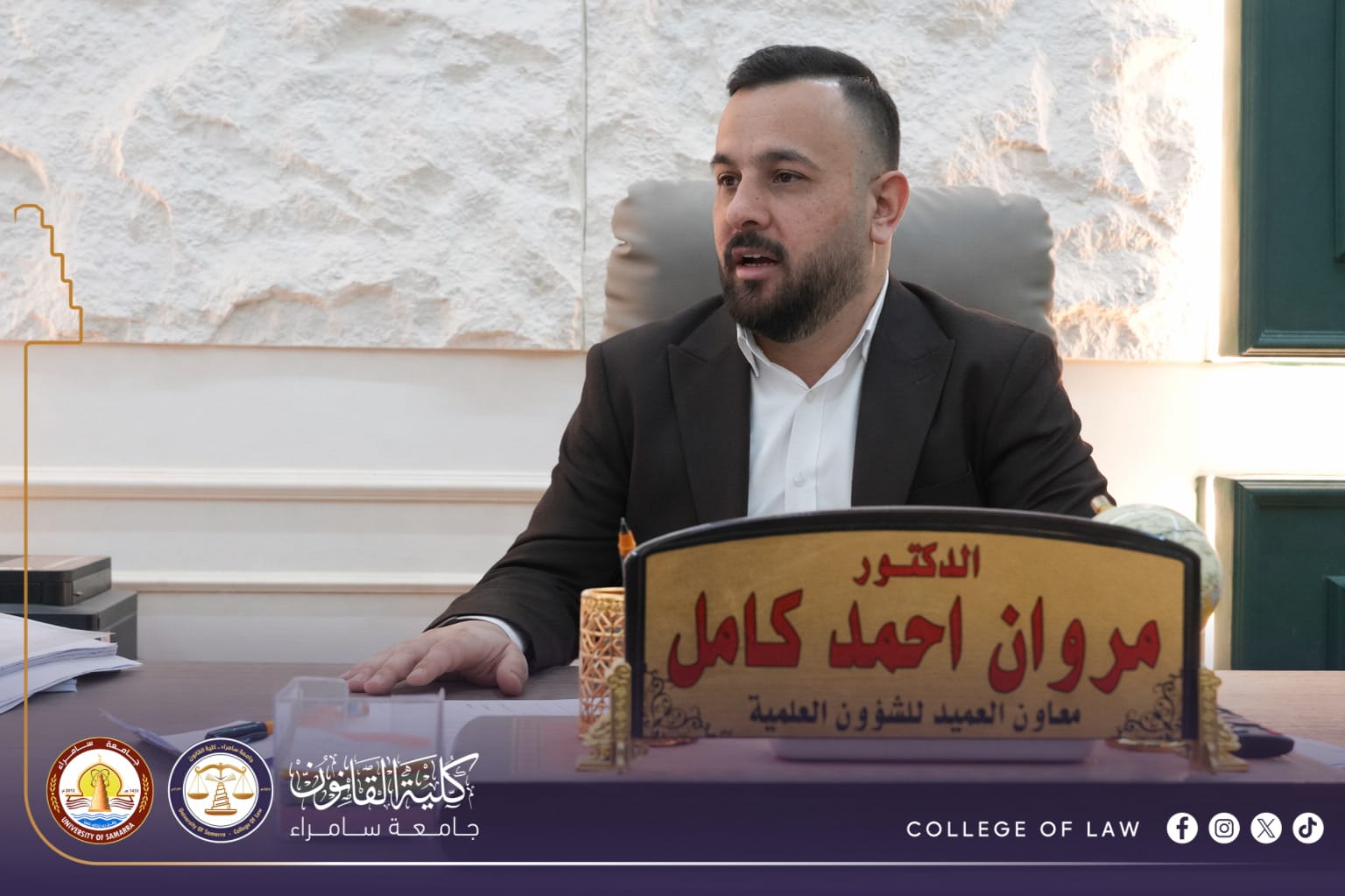 رأس المدرس الدكتور (مروان احمد كامل) معاون العميد للشؤون العلمية في كلية القانون بجامعة سامراء، اجتماعًا موسعًا، بحضور مقررية القسم، ومسؤول وحدة الإرشاد النفسي، ومسؤول وحدة التعليم المستمر، ومسؤول شعبة الدراسات والتخطيط، في المكتب العلمي.