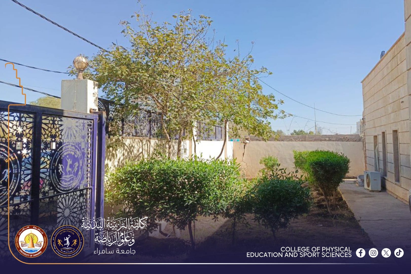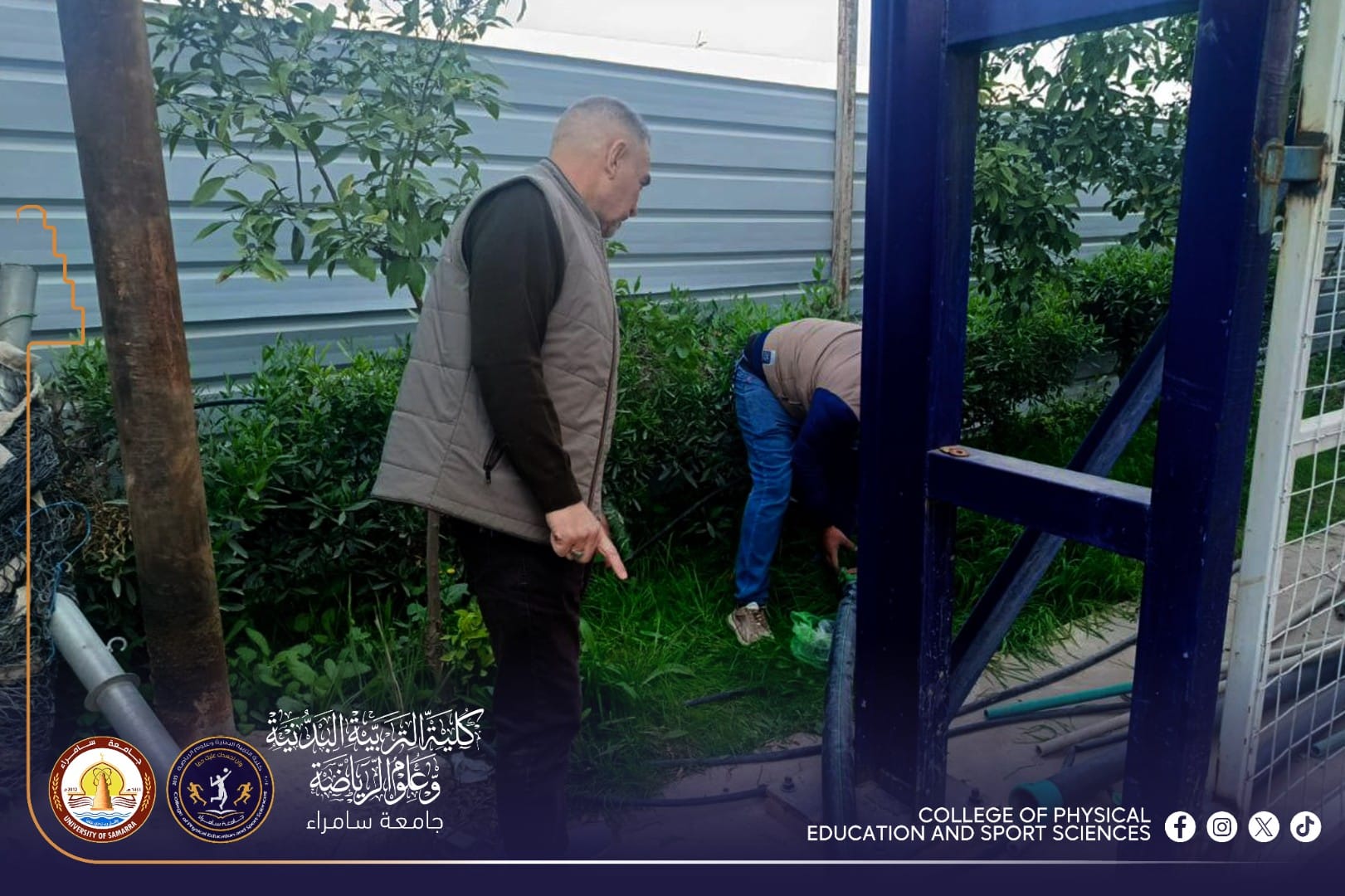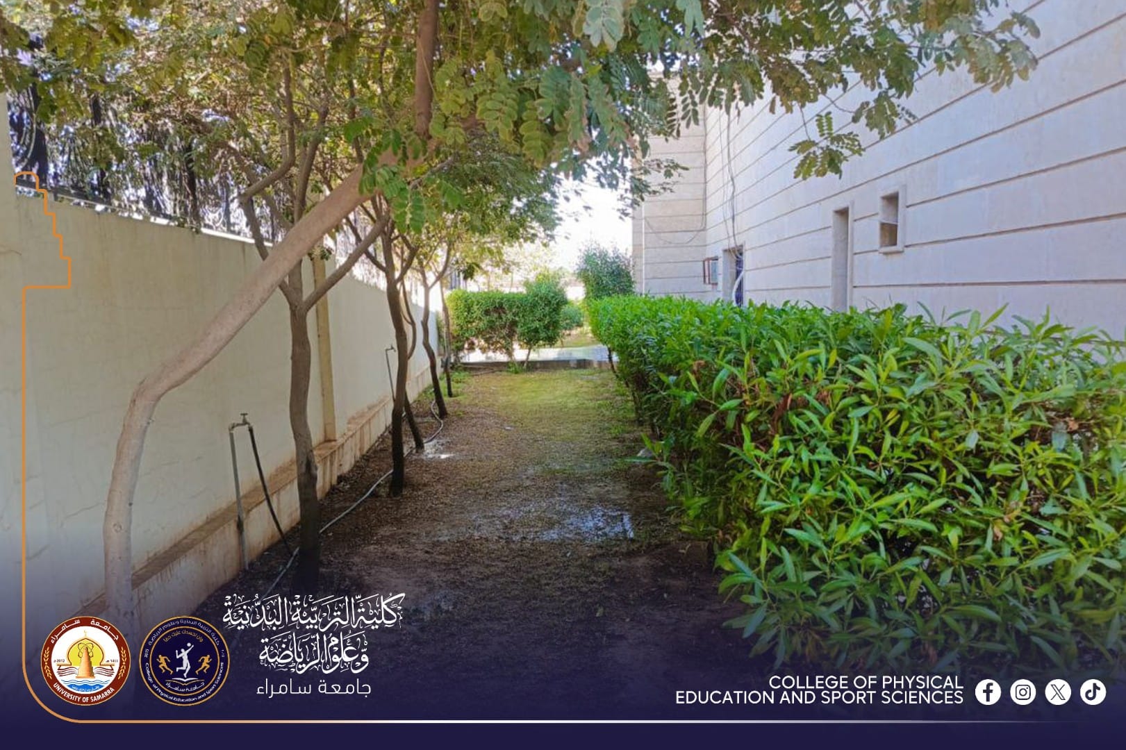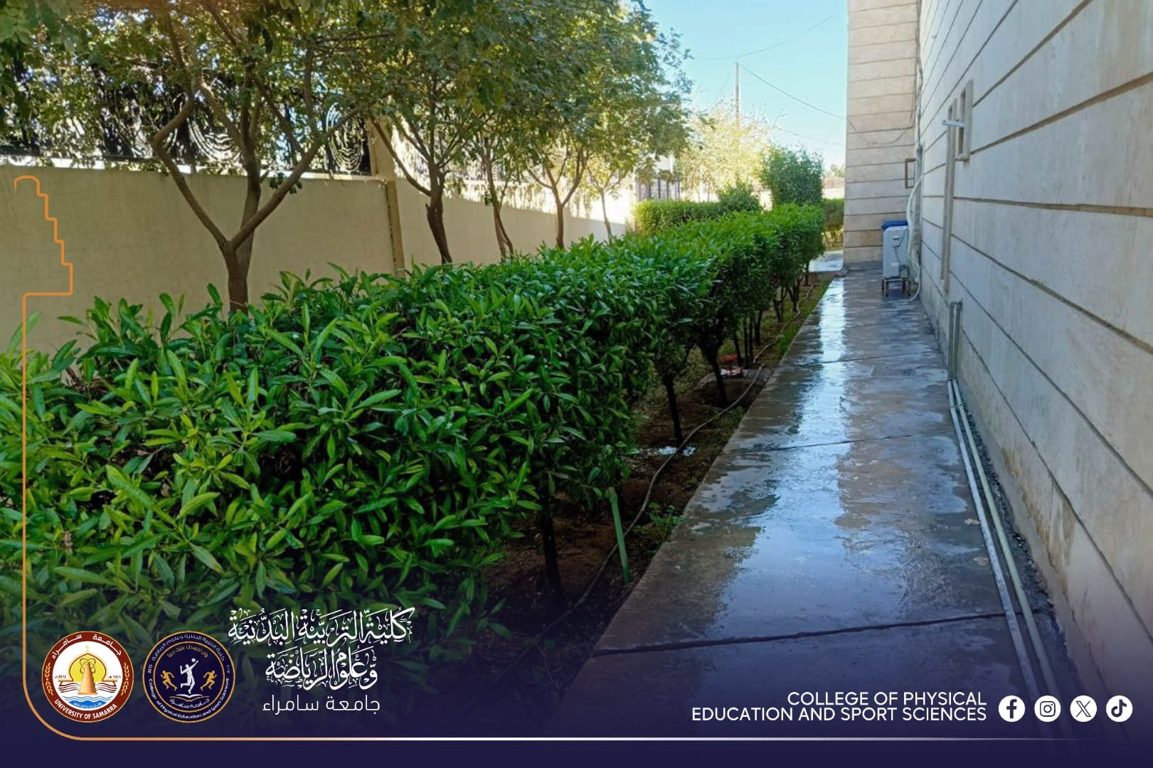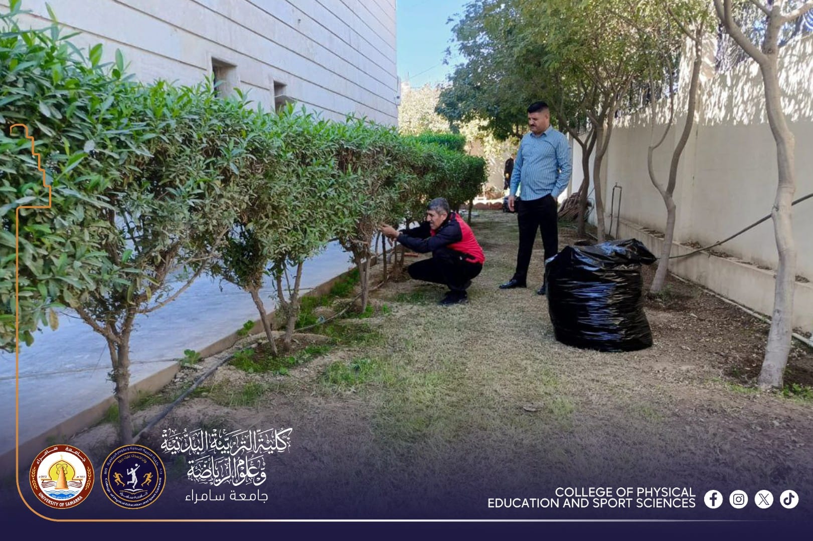 ضمن إطار الاهتمام بالمظهر الحضاري والبيئة الجامعية، نفذت شعبة الخدمات في كلية التربية البدنية وعلوم الرياضة بجامعة سامراء حملة شاملة لتأهيل وتنظيم حدائق الكلية، وذلك بمتابعة مباشرة من المعاون الإداري الأستاذ المساعد الدكتور (محمد علوان شكر).