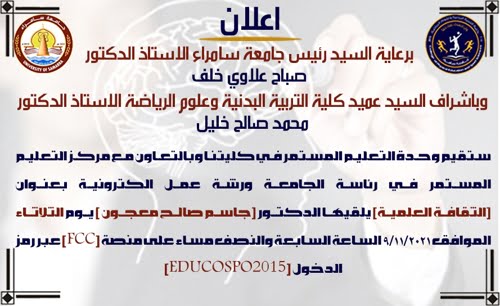 برعاية السيد رئيس جامعة سامراء الاستاذ الدكتور ( صباح علاوي خلف) وباشراف السيد عميد كلية التربية البدنية وعلوم الرياضة الاستاذ الدكتور (محمد صالح خليل) ستقيم وحدة التعليم المستمر في كليتنا وبالتعاون مع مركز التعليم المستمر ورشة عمل افتراضية تحت عنوان ( الثقافة العلمية ) يلقيها الاستاذ المساعد الدكتور (جاسم صالح معجون) يوم الثلاثاء الموافق 9/11/2021 الساعة السابعة والنصف مساءً عبر منصة (FCC) وسيكون رمز الدخول (EDUCOSPO2015)