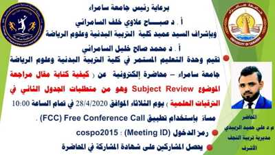 - تقيم وحدة التعليم المستمر في كلية التربية البدنية وعلوم الرياضة جامعة سامراء – محاضرة إلكترونية عن ( كيفية كتابة مقال مراجعة الموضوع Subject Review وهو من متطلبات الجدول الثاني في الترقيات العلمية ).