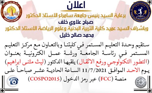 ستقيم كلية التربية البدنية وعلوم الرياضة بالتعاون مع مركز التعليم المستمر في رئاسة الجامعة ورشة عمل في ( التطور التكنولوجي ورفع الاثقال اليوم) يلقيها الدكتور ( ليث مثنى ابراهيم ) وذلك يوم الاحد الموافق 11/7/2021 على منصة (FCC) وسيكون رمز الدخول (COSPO2015)