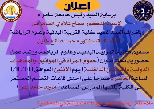 برعاية السيد رئيس جامعة سامراء الاستاذ الدكتور ( صباح علاوي السامرائي) وباشراف السيد عميد كلية التربية البدنية وعلوم الرياضة الاستاذ الدكتور ( محمد صالح خليل) ستقيم وحدة التعليم المستمر في الكلية وبالتعاون مع مركز التعليم المستمر في رئاسة جامعة سامراء ورشة عمل حضورية تحت عنوان ( حقوق المرأة في المواثيق والمعاهدات الدولية والقوانين الداخلية ) وذلك في تمام الساعة العاشرة من صباح يوم الاثنين الموافق 6/12/2021 على احدى قاعات التعليم المستمر في الكلية يلقيها المدرس المساعد ( ماجد حامد بدر ) مسؤول الوحدة القانونية في الكلية .
