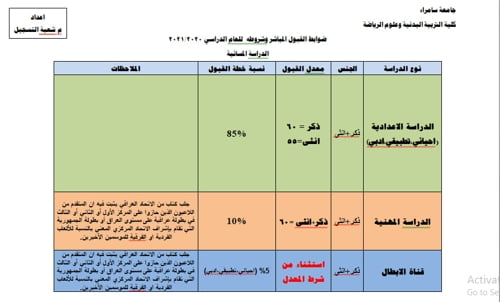 تعلن كلية التربية البدنية وعلوم الرياضة عن فتح باب التقديم للقبول في الكلية الدراسة المسائية للذكور والاناث للدراسة الاعدادية (الاحيائي، التطبيقي، الادبي) والدراسة المهنية للعام الدراسي ٢٠٢٠_٢٠٢١.يبدا التقديم من تاريخ ١٠ / ١١ / ٢٠٢٠ ولمدة شهر.مع تمنياتنا بالتوفيق للجميع.