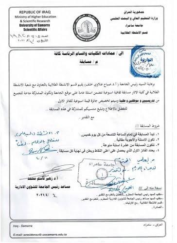 يعلن قسم الأنشطة الطلابية في رئاسة جامعة سامراء عن بدء مسابقة ثقافية أسبوعية تتضمن أسئلة عامة تنشر على الموقع الرسمي لجامعة سامراء في تمام الساعة التاسعة من كل يوم خميس ، كما ان المشاركة متاحة للجميع من تدريسيين وموظفين وطلبة ، وهناك جوائز أسبوعية تقدم للفائز بالمركز الأول .